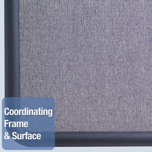 • Durable fabric bulletin board surface backed by high-density fiberboard holds documents securely in place.