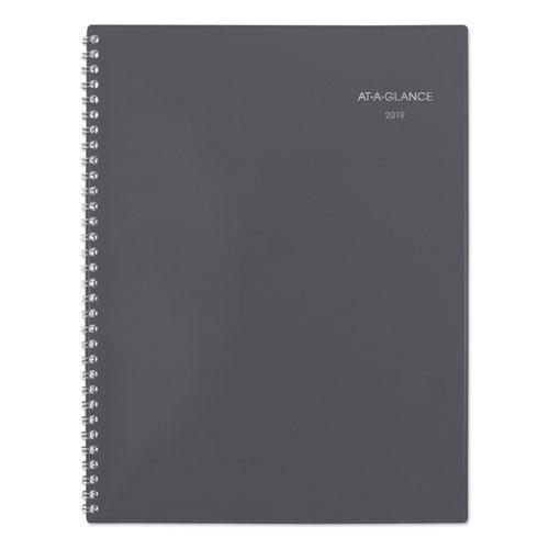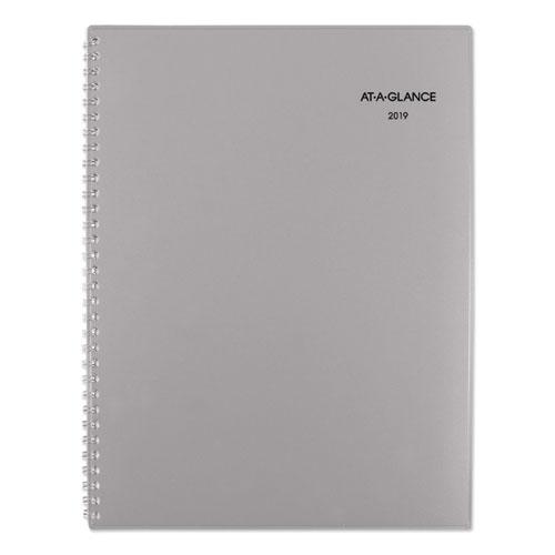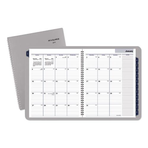 - Tabbed one month per two-page spread with ruled blocks and notes space; past and future months reference.