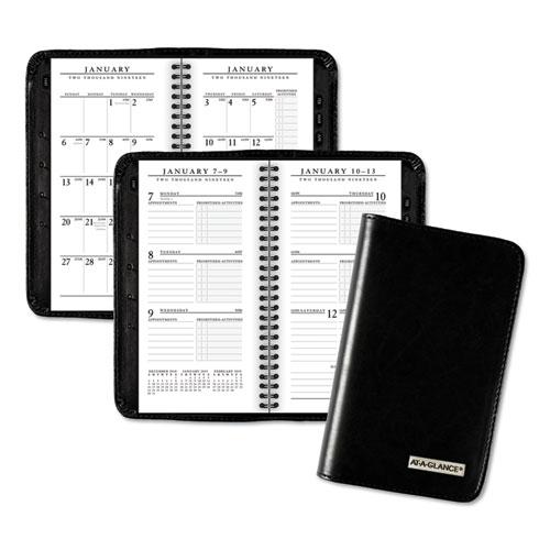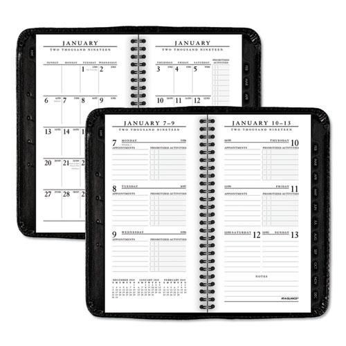 - Weekly: one week per two-page spread, ruled block-style for open scheduling; past, current and future months reference.