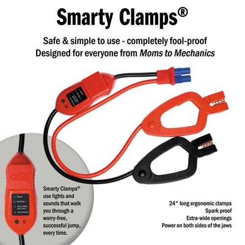 - Revolutionary, patented Smarty Clamps ensure foolproof operation (for anyone from moms to mechanics!) with their automatic safety protections and a series of lights and sounds that will walk you through a worry-free, successful jump, every time.