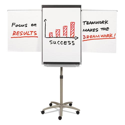 - Mobile presentation easel offers triple functionality: whiteboard, magnetic bulletin board and flipchart stand.