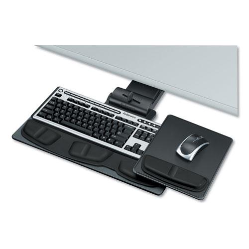 - Height and tilt indicators let you customize keyboard tray settings.