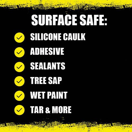 • Removes silicone caulk, contractor’s adhesive, grease, tar, tape, tape residue, varnish, wax and glue.