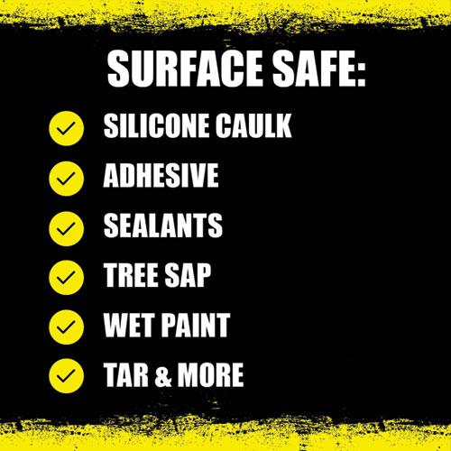 - Removes silicone caulk, contractor’s adhesive, grease, tar, tape, tape residue, varnish, wax and glue.