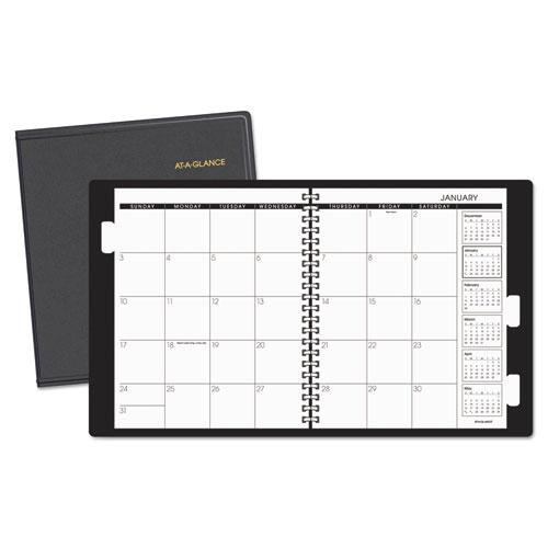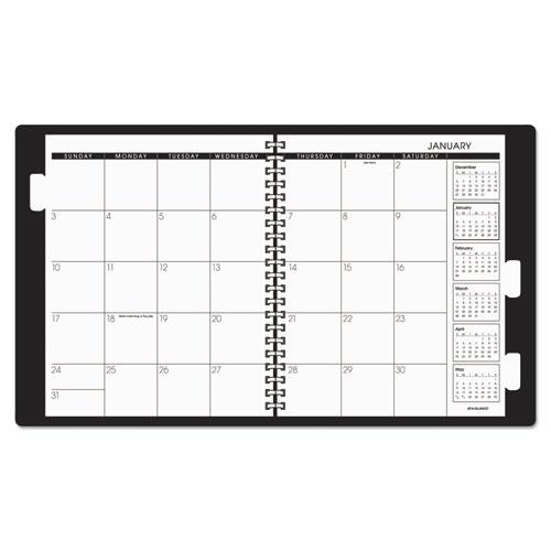 • One month per two-page spread with unruled blocks; past, current and four future months reference.