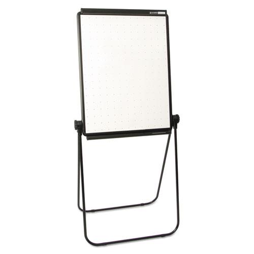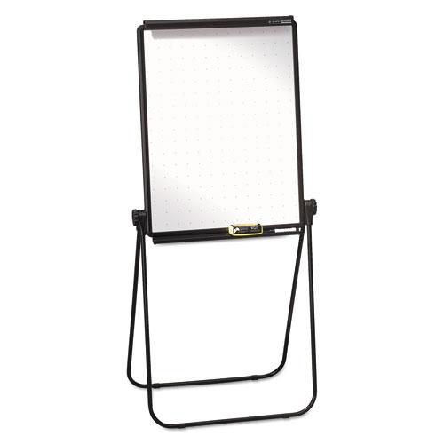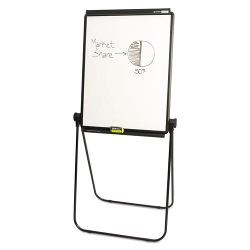 - Portable presentation easel features a flipchart holder and two dry-erase writing surfaces that resist staining and ghosting.