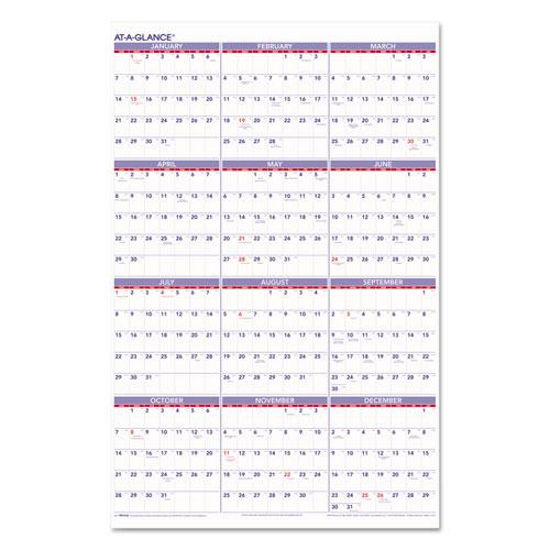 - Alternating quarters are shaded and federal holidays are highlighted in red for clear differentiation.